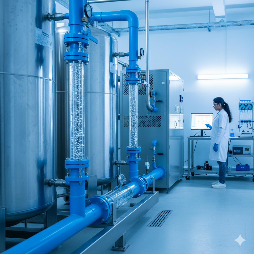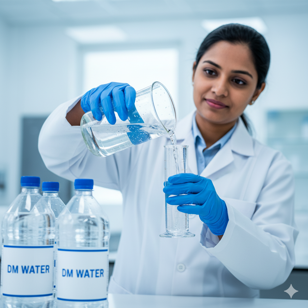 The result is high-purity DM water that meets strict industry requirements for power plants, batteries, pharmaceuticals, laboratories, electronics, and manufacturing units.